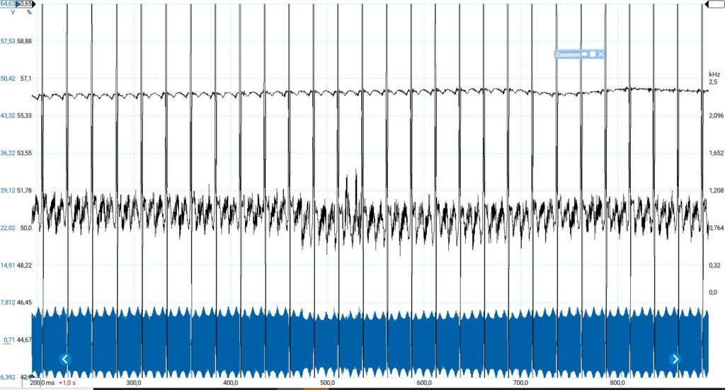 Als iets te mooi lijkt om waar te zijn, Is het dat vaak ook. Zo ook hier. Na een paar dagen rijden komt de klacht toch ineens spontaan weer opzetten. Dit is een mooie kans om de uitmuntende functies in de scope software te gebruiken. We besluiten dan om zowel aan de sensor-zijde als aan de ecu-zijde te meten. We willen dan ook niks missen! Dit levert mooie beelden op. We gaan rijden en al snel begint het lampje te knipperen, vol enthousiasme stoppen we langs de weg om de beelden terug te kijken. Zo op het oog is er niks vreemds te zien. Deze signalen zijn te snel om goed te inspecteren. Hiervoor heeft Pico hele mooie rekenkanalen aan de software toegevoegd. Hierdoor krijg je een grafiek op basis van de door jou ingegeven eenheid. In dit geval kiezen we voor de frequentie. We verwachten tenslotte dat er een korte snelheidsverandering plaatsvindt in het krukassignaal. Zo detecteert de ECU misfires.