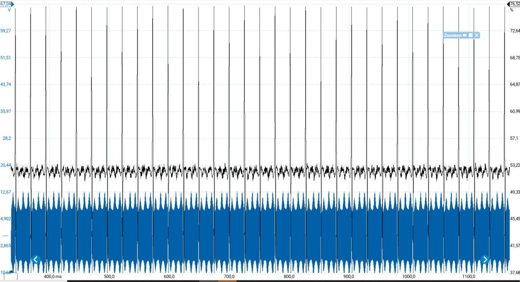In eerste instantie is in de frequentie eigenlijk geen afwijking te vinden. Daarom besluiten we ook naar de duty cycle te kijken. Ookal is er bij een inductief signaal niet echt sprake van een duty cycle, kan je het toch wel gebruiken om afwijkingen te vinden. En net voordat het motorlampje begint te knipperen is er een afwijking te zien. Dit betekent dus dat de ECU geen onnodige handeling verricht maar dat de sensor valse metingen laat zien. Dit probleem moet in de sensor zitten. Als het in de leesring zou zitten zou het probleem zich constant herhalen. We roepen altijd keihard dat je altijd voor originele sensoren moet kiezen maar door backorder wordt er toch een aftermarket sensor besteld. Wel van een OE-kwaliteit, aldus de verpakking.. Het grappige is dat de sensor die we eruit halen van exact hetzelfde merk is. Gaan we hier wel progressie boeken?! We monteren de sensor toch en het probleem verandert eigenlijk niet, het wordt zelfs erger. De pico is gelukkig nog aangesloten dus gaan we gelijk weer aan het analyseren.
