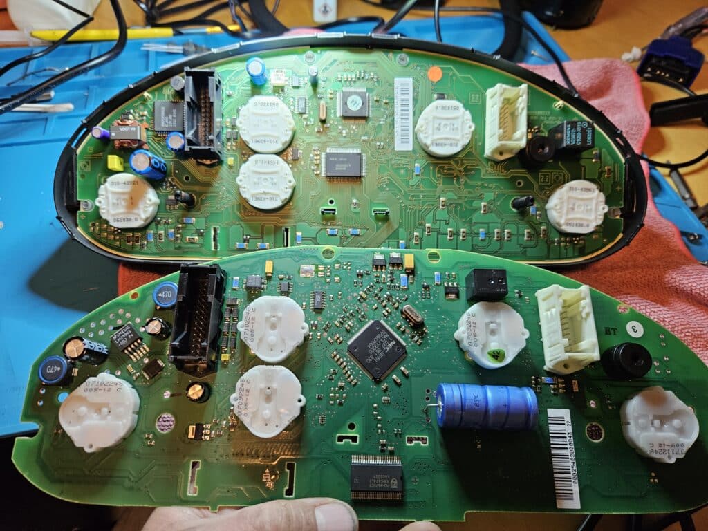 Bij het openen van zowel het defecte als het gebruikte instrumentenpaneel ontdekten we dat, ondanks identieke onderdeelnummers, de interne elektronische componenten door verschillende fabrikanten waren geproduceerd. Dit betekende dat een directe kopie van de gegevens niet mogelijk was. De software-architectuur en opslagstructuur verschilden, waardoor het simpelweg overzetten van data niet werkte.